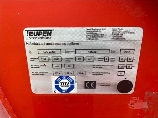 YEAR/MAKE/MODEL: 2012 TEUPEN LEO 23GT CAPABILITIES: 68’10’’ Platform Height / 75’ Work Height / 36’8’’ Horizontal Reach HOURS: 2388 Kubota Diesel Engine & AC Plug-In Electric Power, Auto Self-Leveling Hydraulic Outriggers/Stabilizers, Rubber Non-Marking TRACKS, JIB, Detachable Cabled Remote Control, Sets Up on 30% Slopes, Weighs 6600lbs, 39” Wide, Rotating-Platform *Serviced & Repaired by Teupen USA* *90 DAY WARRNTY on Scope of Work Performed** *NEW ANSI Inspection by Teupen USA*Seller Company: Aerial TitansSeller Name: Sales DepartmentPhone Number: +18882462975Location: Cartersville, Georgia 30120Product Year: 2012Product Manufacturer: teupenProduct Stock Number: 1322Product Operating Condition: OperableProduct Hours: 2388Product Condition: Used