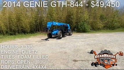 2014 GENIE GTH-844 - Telehandler Reach Forklift Hours- 3,355 8,000lbs Lift Cap / 44’ Lift Height Deutz Diesel Engine, Foam Filled Tires, 4WD, Crab-Steering, Auxiliary Hydraulics, Carriage w/ Forks *FRESH ENGINE SERVICE & NEW ROLLERS ON EXTERNAL CHAIN* No Solicitation Calls View Equipment by Appt OnlySeller Company: GearHeadzSeller Name: Phil StephensPhone Number: +18643053528Location: Pendleton, South Carolina 29670Product Year: 2014Product Manufacturer: genieProduct Stock Number: 12821Product Operating Condition: OperableProduct Hours: 3355Product Condition: Used