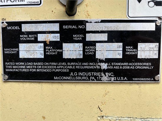 PLATFORM HEIGHT: 31' 9 OVERALL DIMENSIONS:98.5 X 46 PLATFORM SIZE: 98.5 X 44 PLATFORM EXTENSION: 50 LIFT CAPACITY: 700 LBS. EXTENSION CAPACITY: 250 LBS. GRADEABILITY: 25% POWER: 24V WEIGHT: 4975 LBS.Seller Name: CayeDee RhoadesPhone Number: +14697075043Location: Garland, Texas 75040Product Year: 2008Product Manufacturer: jlgProduct Stock Number: JLG8983Product Operating Condition: OperableProduct Hours: 77Product Condition: Used